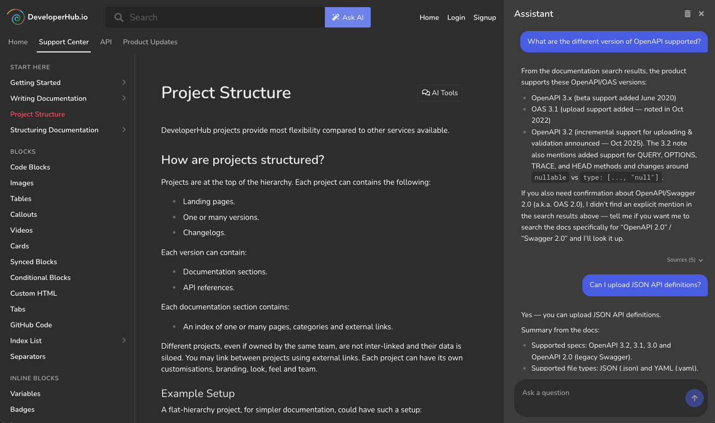 AI Assistant allows the readers to ask a questions about the docs and API endpoints, delivering GPT-powered responses. Features of AI Assistant: