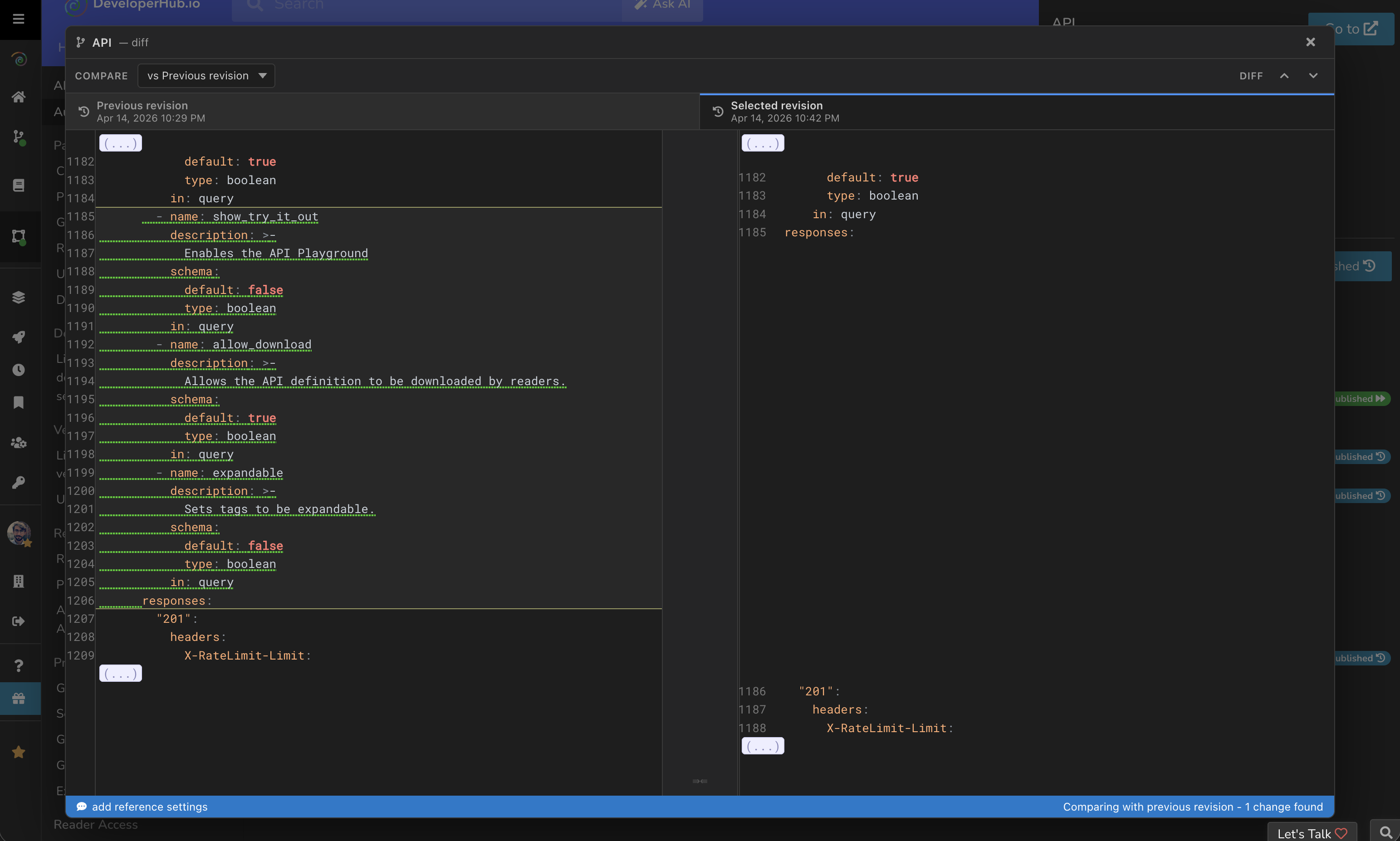 Use Diff API Revisions to compare the OpenAPI definitions between revisions. This is useful for quickly reviewing what changed between versions without leaving the API Reference viewer.