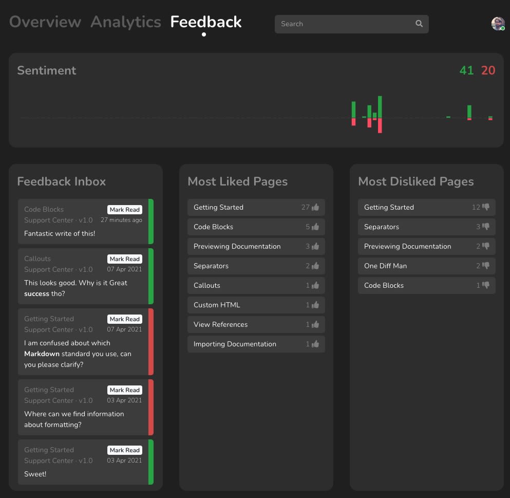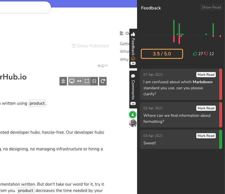 To ensure that your documentation is of high quality, up-to-date, and brings the needed information to your readers, then gathering feedback from your readers is of high importance. DeveloperHub brings feedback to your readers on the pages, and crunches the data out for you in the dashboard, so you can iterate on the docs and have happier readers.