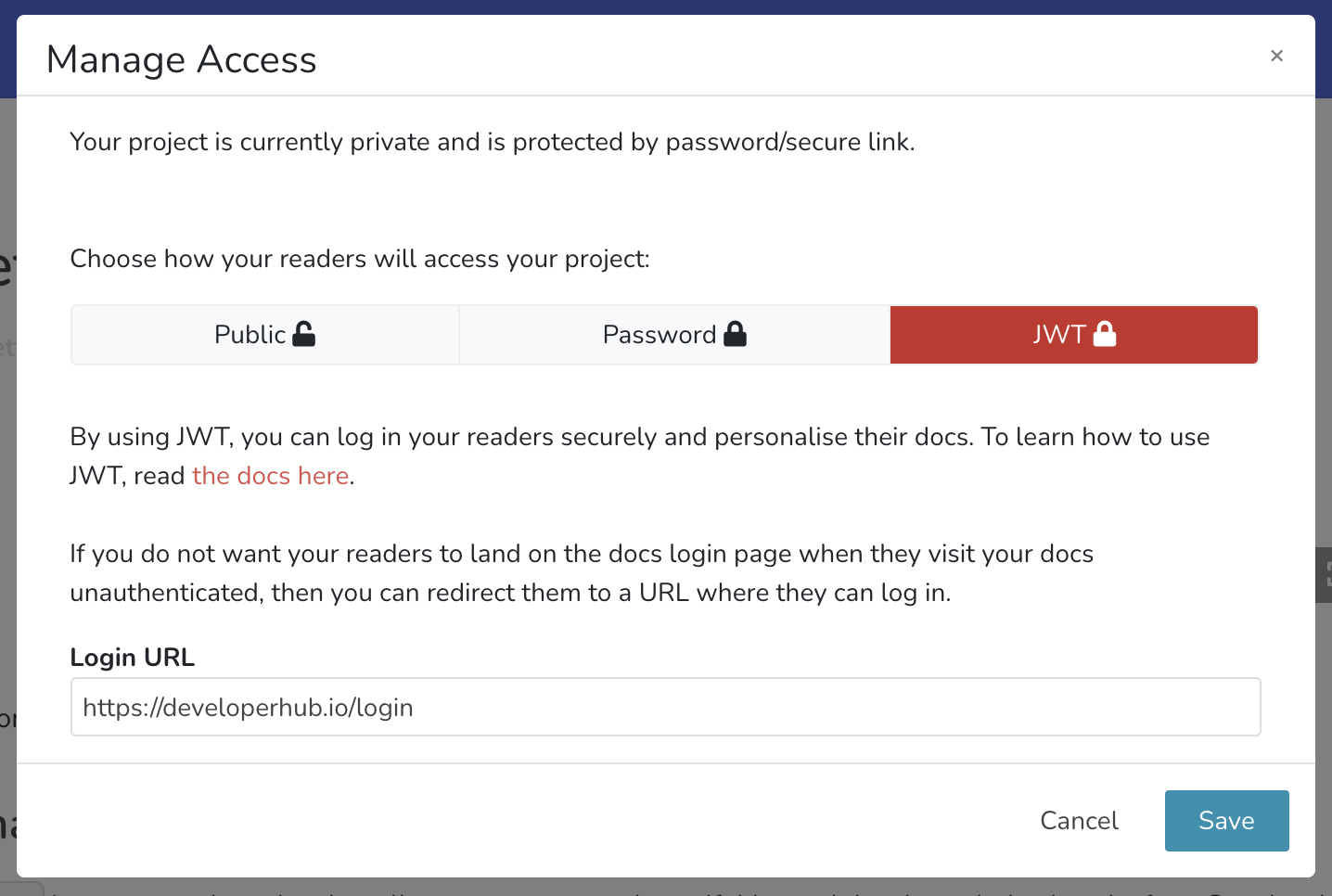 access.writepermission, construct a URL containing the JWT token, and redirect the reader to it. The URL is the URL of your docs site. - When the reader tries to access the docs site unauthenticated with the JWT token in the URL, our backend servers will verify the token and create an access token with the expiry defined in the token. The reader can now access the docs site.